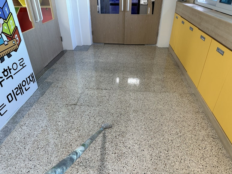 바닥 그림이 끝나는 부분은 복도 바닥 색과 자연스럽게 이어지도록 그러데이션 처리를 해주었어요