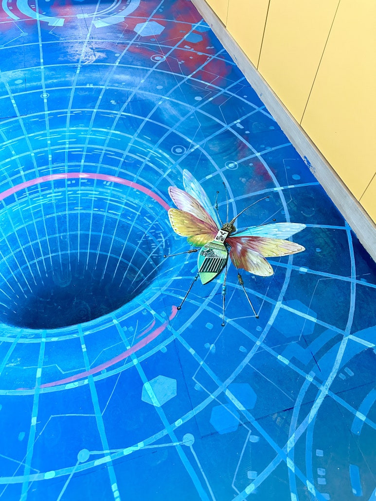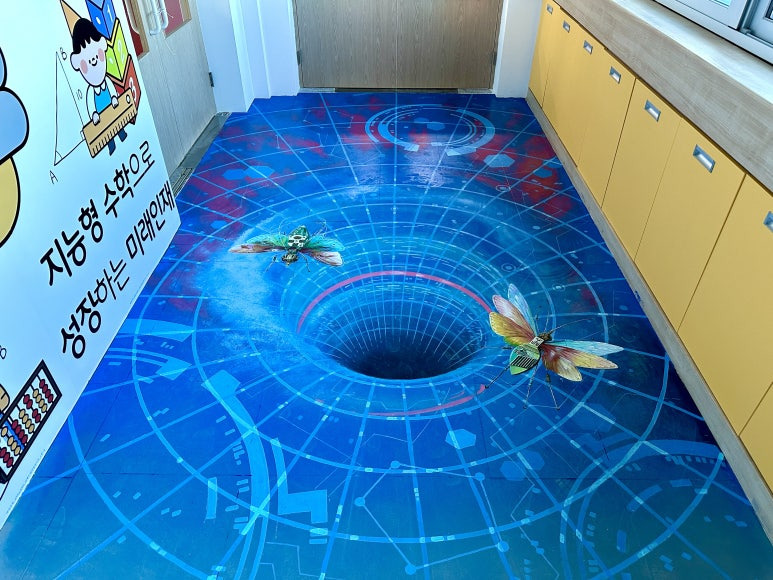 바닥 착시 벽화의 콘셉트는 우리가 살아가는 공간에서 월홈을 통해 미래로 빠져 들어가는 바닥 트릭아트입니다